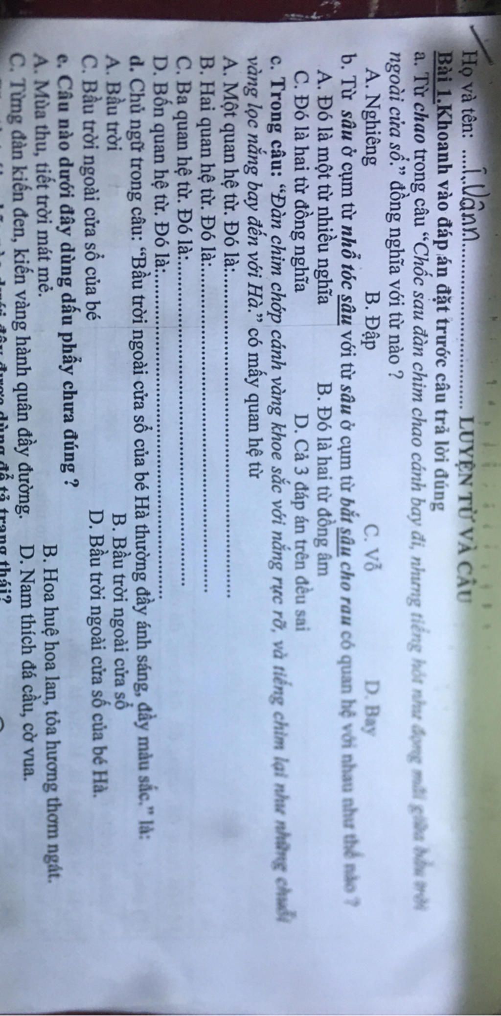 `d)` `=>A.` Bầu trời ngoài cửa sổ của bé Hà