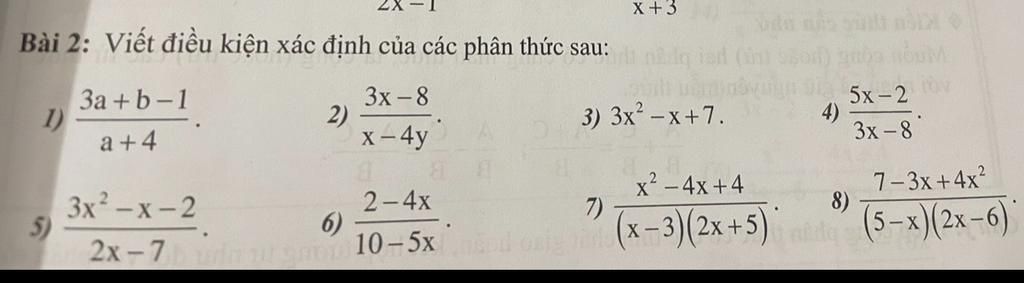 7) `{(x-3 ne 0 ),(2x+5 ne 0 ):}`