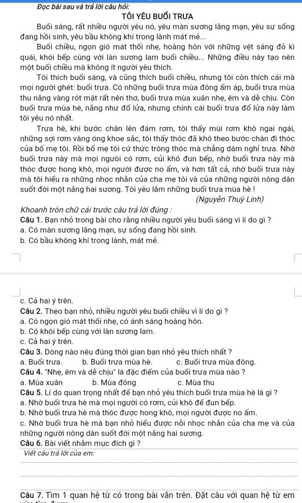 `6.` Bài viết nhằm mục đích: thông qua bề mặt từ ngữ, việc người viết thích nhất buổi trưa mùa hè đã nói lên được sự vất vả của những người nông dân lam lũ, ca ngợi tinh thần chăm chỉ, hăng say làm việc, thể hiện tình cảm, sự biết ơn của tác giả.