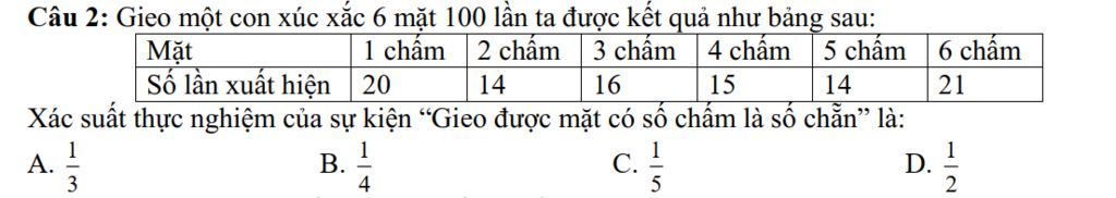 Xác suất thực nghiệm của sự kiện “Gieo được mặt có số chấm là số chẵn” là `:`