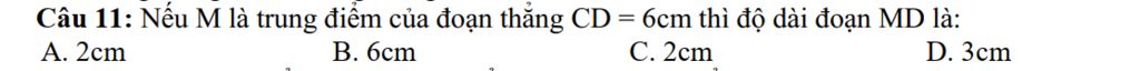 `->``D`$\\$ Nếu `M` là trung điểm của đoạn thẳng `CD = 6cm` thì độ dài đoạn `MD=CM=6/2=3cm`$\\$$#hoangnam$