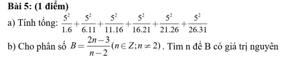 a) Tính tổng: $\frac{5^2}{1.6}$+ $\frac{5^2}{6.11}$ + $\frac{5^2}{11.16}$+ $\frac{5^2}{16.21}$+ $\frac{5^2}{21.26}$+ $\frac{5^2}{26.31}$