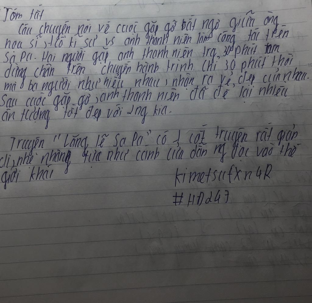 +)Tóm tắt:anh thanh niên công việc(....)gặp gỡ hai người cô kĩ sư và ông họa sĩ khi xe dừng chân mời lên nhà , nói chuyện tặng quà xe hết nghỉ 30p tiếp tục đi chào tạm biệt cô kĩ sư và ông họa sĩ lần sau gặp lại