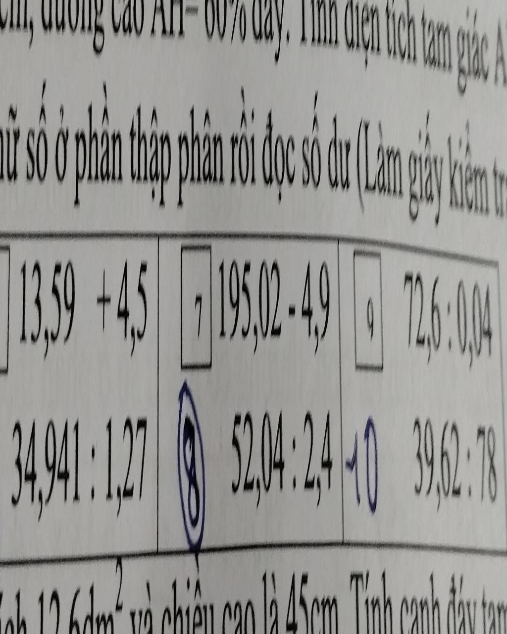 Đặt tính rồi tính thương có 3 chữ số ở phần thập phân rồi đọc số dư ( tính hộ e các phép chia ạ)