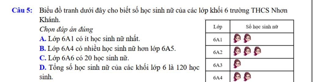 `B.` Loại. Lớp `6A4:20` bạn nữ, lớp `6A5:30` bạn nữ, vì `20<30` nên sai