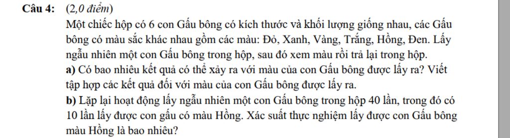 `⇒` Gọi `A` là tập hợp của các kết quả đối với màu của con gấu bông được lấy ra vậy ta có `: A = { Đỏ; Xanh; Vàng; Hồng; Trắng; Đen }`