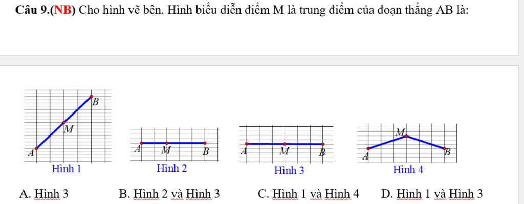 `-` Hình `4,` ta thấy `AM=MB` nhưng `M` không phải là trung điểm của đoạn thẳng `AB`