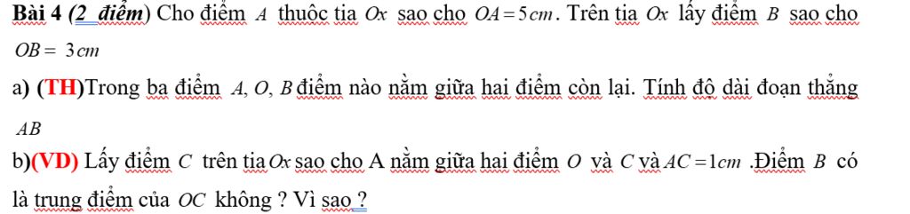 Bài 4 (2 điểm) Cho điểm 4 thuộc tia Ox sao cho O4=5cm. Trên tia Ox lấy điểm B sao cho OB = 3 cm