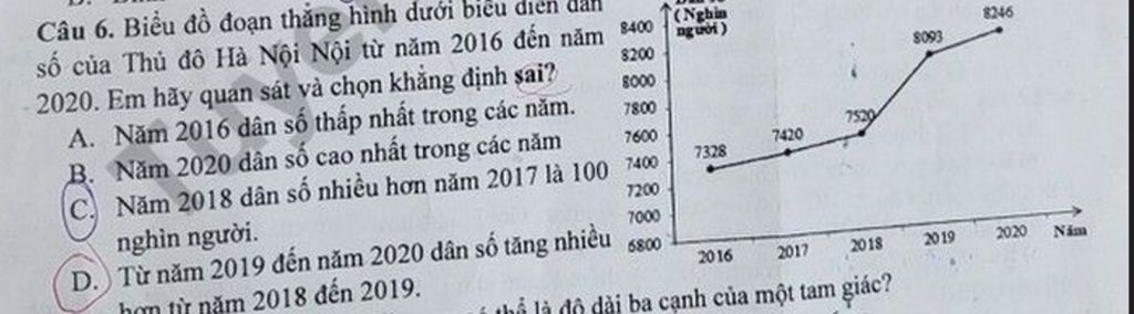 Suy ra từ năm `2019` đến năm `2020` dân số tăng ít hơn từ năm `2018` đến năm `2019` `=>` Câu `bbD` sai. `(` thỏa mãn `)`