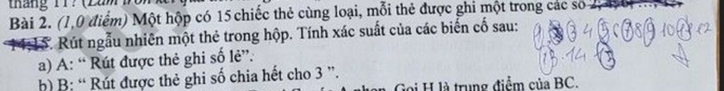 Bài 2. (1,0 điểm) Một hộp có 15 chiếc thẻ cùng loại, mỗi thẻ được ghi một trong các số: "2;4;6;...12;14;15". Rút ngẫu nhiên một thẻ trong hộp. Tính xác suất của các biến cố