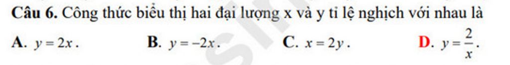 `@` Công thức: Nếu `y=2/x` thì đại lượng `y` tỉ lệ nghịch với đại lượng `x` theo hệ số tỉ lệ là `2`