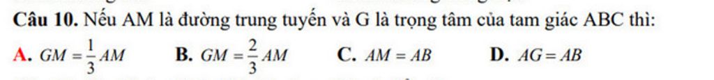 `@ ` Tính chất trọng tâm của tam giác: Khoảng cách từ trọng tâm tới `3 ` đỉnh của tam giác bằng `2/3 ` độ dài từ đường trung tuyến ứng với đỉnh đó.