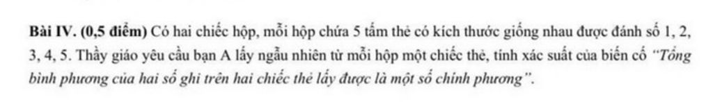 Vậy xác suất của biến cố “Tổng bình phương của hai số ghi trên hai chiếc thẻ lấy được là một số chính phương" là `1/7`