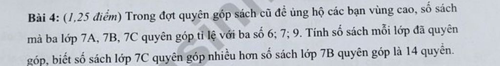 Ta có: số sách ba lớp `7A, 7B, 7C` quyên góp được tỉ lệ với `6; 7; 9`