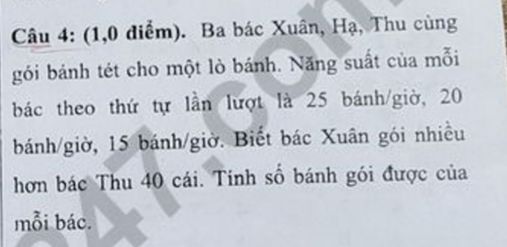 Ta có: ba bác Xuân, Hạ, Thu gói được với tỉ lệ `25` bánh/giờ, `20` bánh/giờ, `15` bánh/giờ