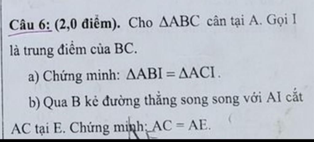 Câu 5: (1,0 điểm). Cho ΔABC cân tại A. Gọi I là trung điểm của BC