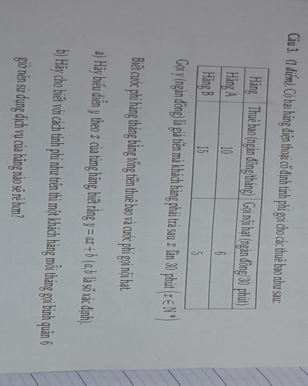 Câu 3. (1 điểm). Có hai hãng điện thoại cố định tính phí gọi cho các thuê bao như sau: