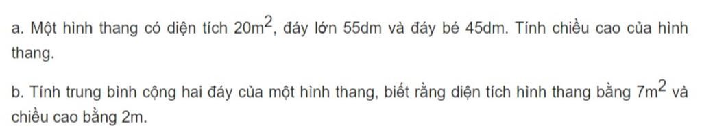 a) Đổi: 20m2 = 2000 dm2 Tổng đáy lớn và đáy bé hình thang là: 55 + 45 = 100 (dm) Chiều cao của hình thang là: 2000 × 2 : 100 = 40 (dm) b) Trung bình cộng hai đáy hình thang là: 7 : 2 = 3,5 (m) Đáp số: a) 40dm; b) 3,5 m.
