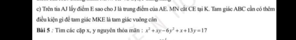 c) Trên tia AJ lấy điểm E sao cho J là trung điểm của AE. MN cắt CE tại K. Tam giác ABC cần có thêm