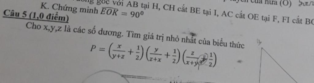 \(P=\dfrac{2x+y+z}{2(y+z)}.\dfrac{2y+x+z}{2(z+x)}.\dfrac{2z+x+y}{2(x+y)}\\P=\dfrac{[(x+y)(x+z)][(x+y)+(y+z)][(y+z)+(z+x)]}{(x+y)(y+z)(z+x)}\ge\dfrac{2\sqrt{(x+y)(x+z)}.2\sqrt{(x+y)(y+z)}.2\sqrt{(y+z)(z+x)}}{8(x+y)(y+z)(z+x)}=1\\\Rightarrow min_P=1\Leftrightarrow x=y=z\)
