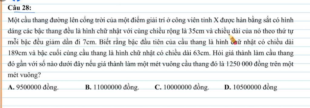 mỗi bậc đều giảm dần đi 7cm. Biết rằng bậc đầu tiên của cầu thang là hình chữ ...