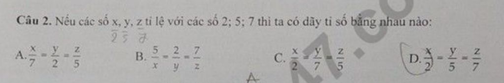 `@` Các số `x,y,z` tỉ lệ với các số `2,5,7` thì ta có dãy tỉ số bằng nhau: `x/2=y/5=z/7`