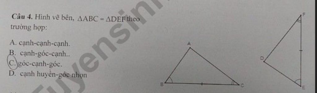 `=> triangle ABC = triangle DEF` ( góc cạnh góc )
