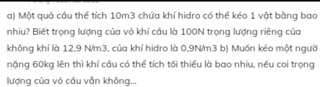 Muốn kéo người có khối lượng `m' = 60 (kg)` lên thì thể tích tối thiếu của quả khinh khí cầu là `V' (m^3)`.