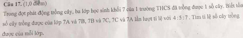 số cây trồng được của lớp 7A và 7B, 7B và 7C, 7C và 7A lần lượt tỉ lệ với 4:5:7 . Tìm tỉ lệ số cây trồng