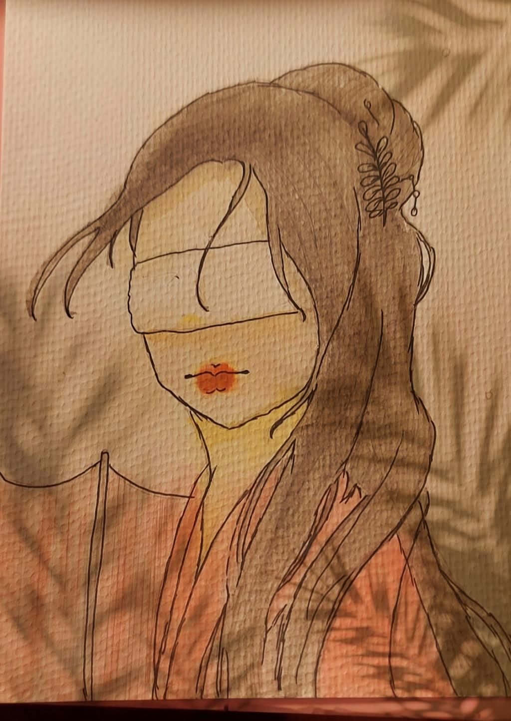 2) Theo mình thì bạn nên bỏ cái bịt mắt đi ạ nếu bạn không vẽ được cả 2 còn mắt thì bạn nên chú tâm vẽ một mắt trước còn còn mắt còn lại bạn vẽ đề lên là quạt hay bông hoa cũng được hoặc để cho tóc che hết đi