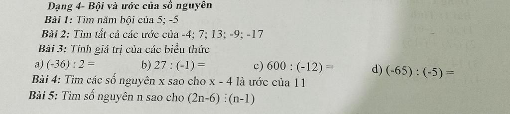 Bài 2: Tìm tất cả các ước của \(-4\), \(7\), \(13\), \(-9\), \(-17\)