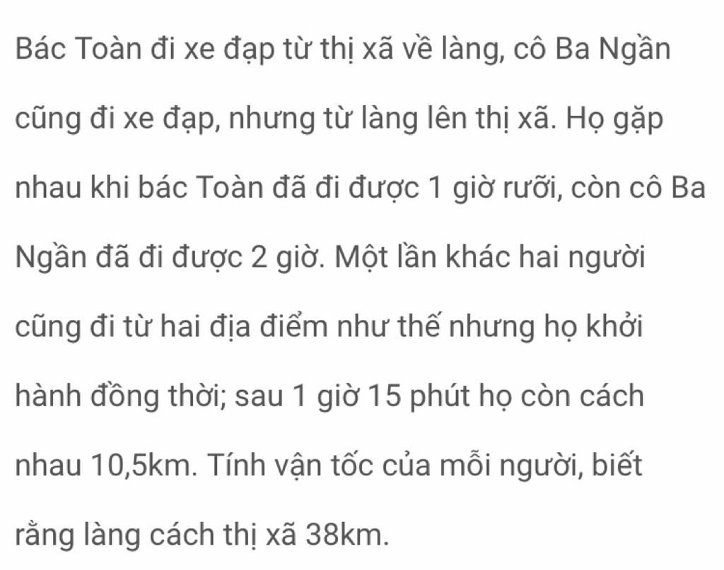 Sau `1` giờ `15` phút , bác Toàn và cô Ba Ngần còn cách nhau `10,5 km` nên ta có phương trình: