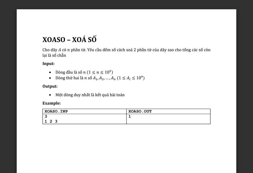 `*` Nếu tổng ban đầu là số chẵn, vậy ta cần xoá 2 phần tử sao cho tổng của 2 phần tử này là số chẵn.