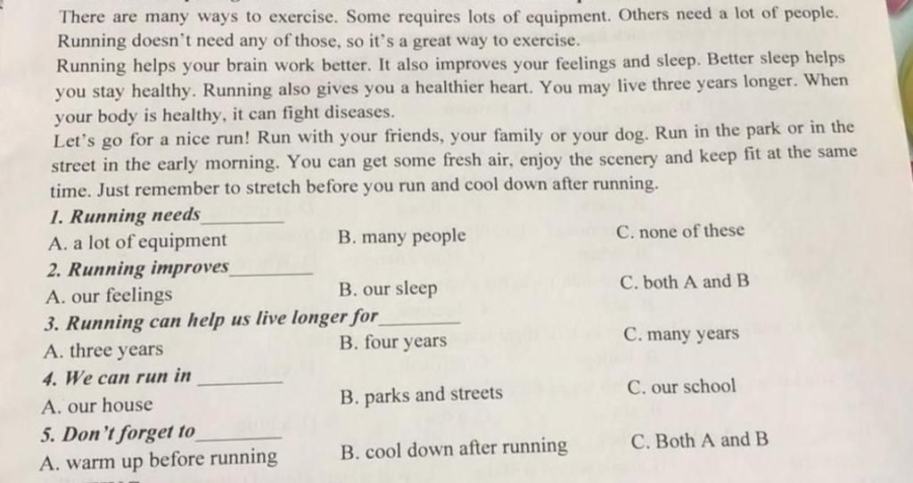 -> Thông tin: Câu cuối cùng đoạn thứ 3: Just remember to strecth before you run and cool down after morning.