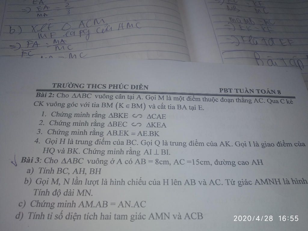 Bài 2: Cho AABC vuông cân tại A. Gọi M là một diểm thuộc doạn thắng AC. Qua C kẻ