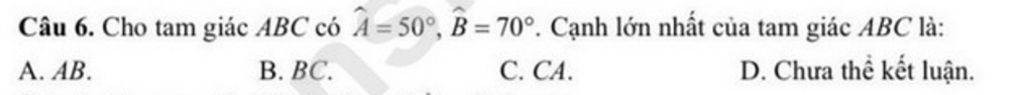 Ta có: `hatA=50^@, hatB=70^@,hatC=60^@`