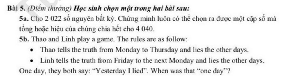5a. Cho 2 022 số nguyên bất kỳ. Chứng minh luôn có thể chọn ra được một cặp số mà tổng hoặc hiệu của chúng chia hết cho 4 040.