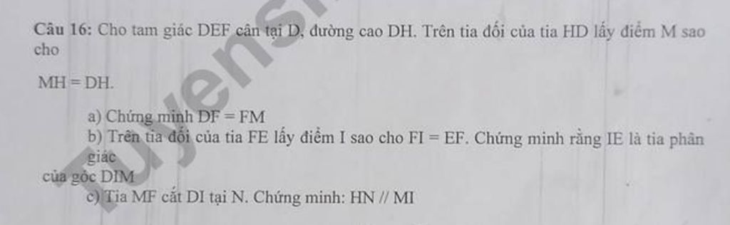 Câu 16: Cho tam giác DEF cân tại D, đường cao DH. Trên tia đối của tia HD lấy điểm M sao cho MH = DH.