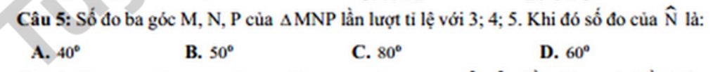 Vì số đo ba góc `M, N, P ` lần lượt tỉ lệ với `3; 4; 5`