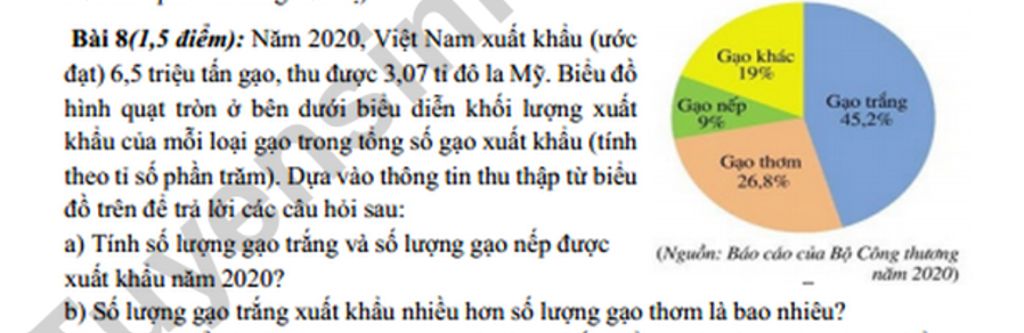 Số lượng gạo trắng được xuất khẩu năm 2020 là: `6,5 xx 45,2% = 2,938` (triệu tấn)