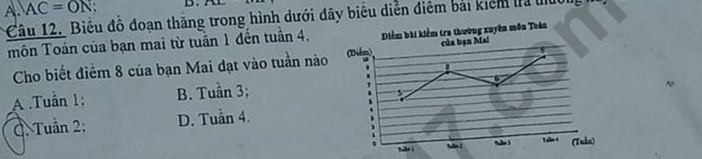 Câu 12. Biểu đồ đoạn thăng trong hình dưới đây biểu diễn điểm bài kiểm tra môn Toán của bạn mai từ tuần 1 đến tuần 4. Cho biết điểm 8 của bạn Mai dạt vào tuần nào?