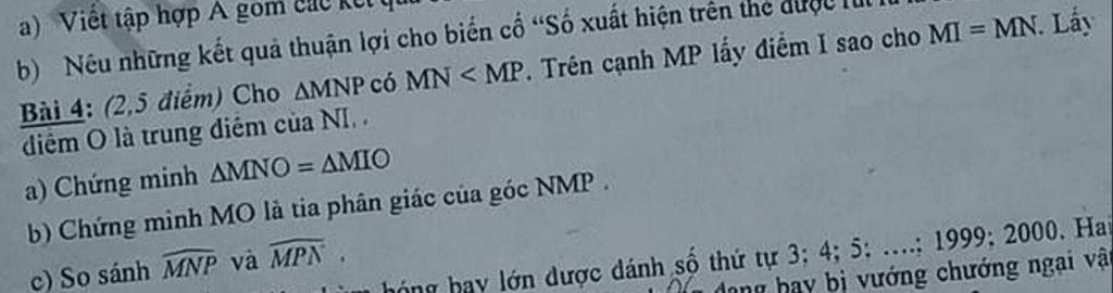 Bài 4: (2,5 điểm) Cho $\triangle$MNP có MN < MP. Trên cạnh MP lấy điểm I sao cho MI = MN. Lấy diễm O là trung điểm của NI, .