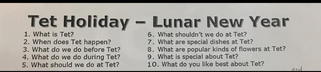 Tết là tên gọi thông dụng của Tết Việt, viết tắt của Tết Nguyên Đán có nghĩa là Lễ hội sáng mùng một. Nó còn được gọi là lễ hội mùa xuân hoặc Tết Nguyên Đán. Tết được tổ chức vào ngày mồng 1 ( hoặc ngày mùng 1 ) của tháng giêng âm lịch. Tết có 3 ngày chính, tuy nhiên, người Việt thường phải mất cả tuần để chuẩn bị trước. Họ dọn dẹp nhà cửa và trang trí bằng hoa và cây quất hay hoa đào. Một lượng lớn nguyên liệu thực phẩm sẽ được mua trước Tết để làm các món ăn truyền thống. Bánh Chưng, Giò Chả, Bánh Tét, Xôi Mút,... và bánh kẹo là những món ăn có thể dễ dàng bắt gập trong dịp Tết. Trong 3 ngày chính Tết, mọi người đến thăm nhà họ hàng và chúc phúc. Tuy nhiên, người Việt tin rằng vị khách tới vạn mệnh cả năm. Vì vậy, người ta không bao giờ vào nhà nào vào ngày mùng một Tết nếu không được mời trước. Một phong tục truyền thống khác là tặng tiền lì xì, được đựng trong phong bò màu đỏ như biểu tượng của sự may mắn và lời cầu mong một tuổi mới cho trẻ em và người lớn tuổi. Ngoài ra, sau 3 ngày, người Việt thường đi chùa, chùa để cầu tài, sức khỏe, thành đạt,... Với người Việt, Tết là khoảng thời gian vui vẻ nhất trong năm vì các thành viên trong gia đình có thể quậy quần, đón Tết cùng nhau. Nói chung, Tết là về nhà, đối xử tối với người khác, tận hưởng khoảnh khắc quý giá và cầu mong những điều tối đẹp nhất sẽ đến.