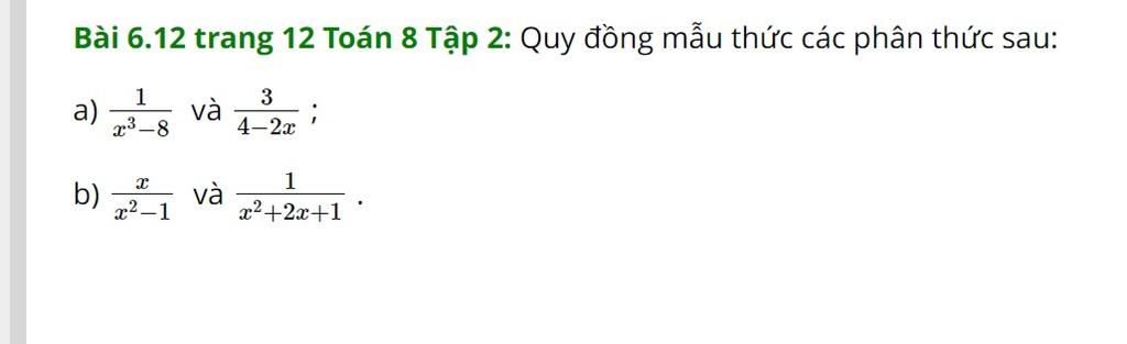 `\frac{1}{x^{3}-8}` và `\frac{3}{4-2x}`
