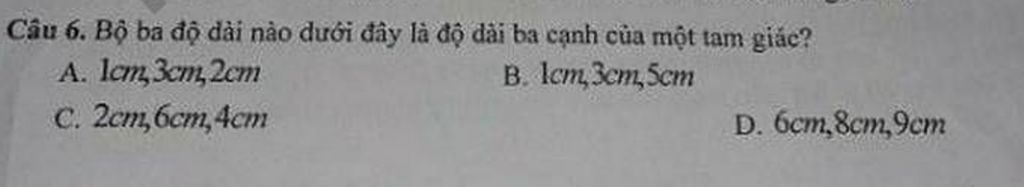 `D. {(6+8>9),(6+9>8),(9+8>6):}->` Chọn