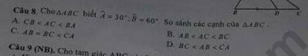 Ta có `:hat{A}<hat{B}<hat{C}=>CB<AC<BA`