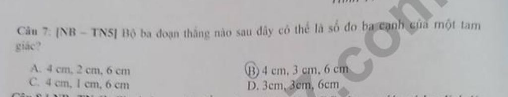`B. {(4+3>6),(4+6>3),(3+6>4):}->` Chọn