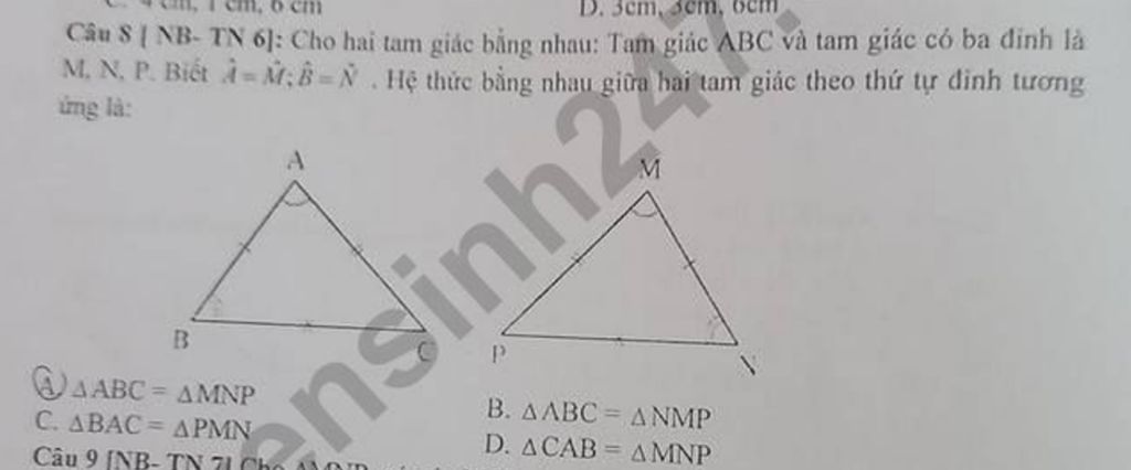`->` Hệ thức bằng nhau giữa hai tam giác theo thứ tự đỉnh tương ứng là `triangle ABC=triangle MNP`