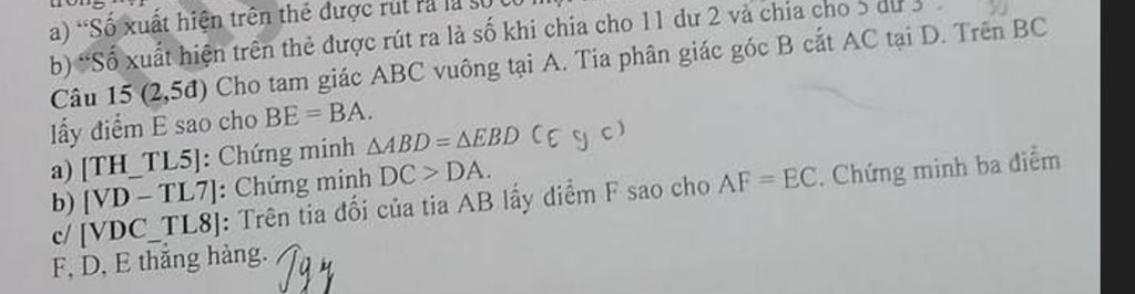 Câu 15 (2,5đ) Cho tam giác ABC vuông tại A. Tia phân giác góc B cắt AC tại D. Trên BC lấy điểm E sao cho BE = BA.