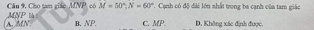 Ta có: `hatM=50^@, hatN=60^@,hatP=70^@`